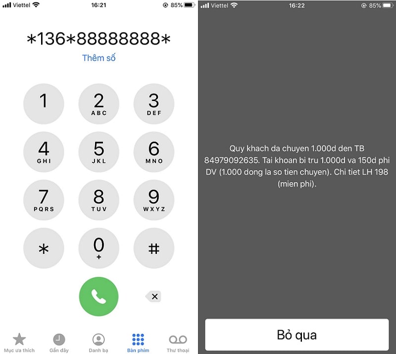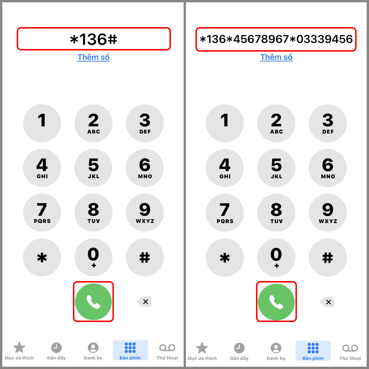 Tiếp theo, bạn cần nhập số điện thoại người nhận tiền. Lưu ý rằng họ cũng phải là thuê bao Viettel. Sau khi nhập xong số điện thoại, bạn sẽ tiến hành nhập số tiền muốn chuyển. Ví dụ, nếu bạn muốn gửi 20.000 đồng cho số 033777888, bạn chỉ cần theo cú pháp *136*Mật-khẩu*033777888*20000# và nhấn Gọi.