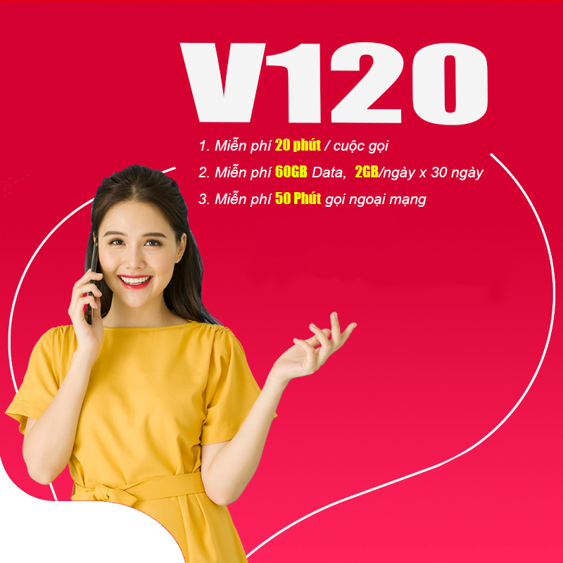 Gói V120 mang lại nhiều ưu đãi hấp dẫn như 2GB data mỗi ngày, tổng cộng 60GB trong suốt 30 ngày sử dụng. Đặc biệt, bạn sẽ được miễn phí toàn bộ các cuộc gọi nội mạng dưới 20 phút, giúp tiết kiệm chi phí liên lạc hàng ngày. Ngoài ra, bạn còn nhận 50 phút gọi ngoại mạng miễn phí.