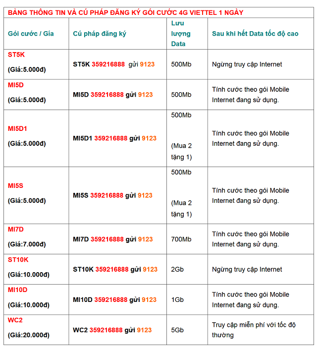 Ngoài ra, Viettel còn cung cấp nhiều gói cước linh hoạt khác như gói MI2K, MI3K với mức giá chỉ từ 2K đến 5K mỗi ngày, phù hợp với nhu cầu sử dụng hàng ngày. Để đăng ký nhanh nhất, bạn có thể truy cập website ViettelData.vn và bấm vào nút Đăng Ký, hệ thống sẽ tự động soạn tin nhắn cho bạn.