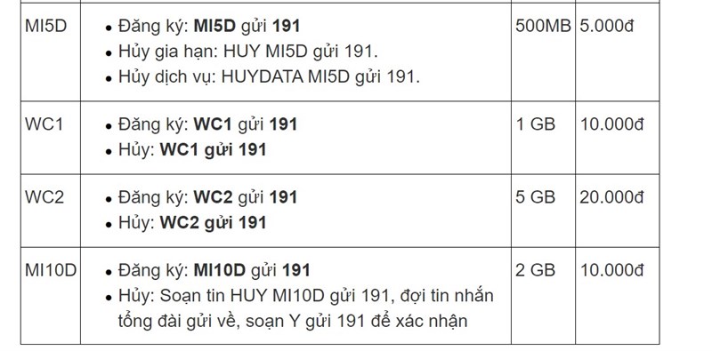 Nếu bạn muốn đăng ký các gói cước cụ thể, chỉ cần soạn tin nhắn với tên gói gửi 191. Ví dụ, để đăng ký gói ST5K, bạn soạn “ST5K MO” gửi 9123. Đối với gói MXH100, bạn soạn “MXH100 NET” gửi 290. Một số gói cước khác cũng dễ dàng đăng ký như ST70K hay ST10K bằng cú pháp tương tự.
