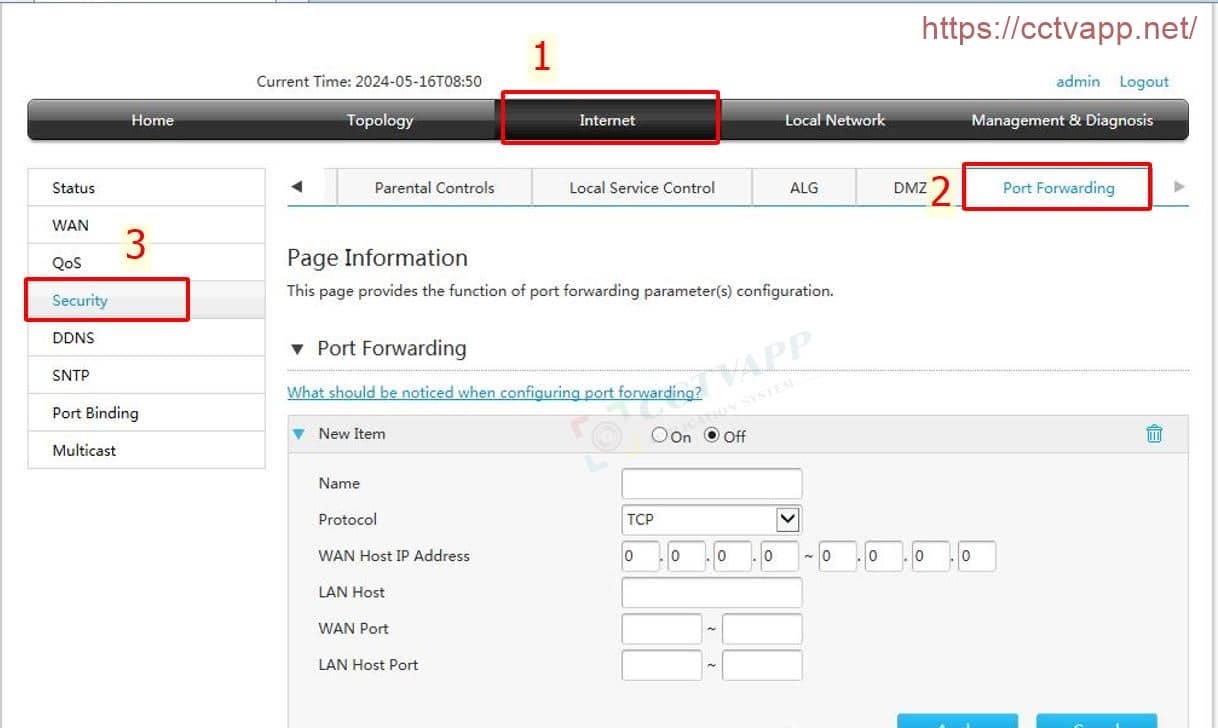 Chúng ta sẽ tiến hành bước mở port camera. Tùy theo loại modem, bạn truy cập vào phần Application, Advanced Setup hoặc NAT. Tại đây, chọn Port Forwarding hoặc Virtual Server, sau đó nhấn Add để thêm cổng mới. Bạn cần nhập thông tin như địa chỉ IP của camera (ví dụ: 192.168.1.19) và các cổng cần mở.