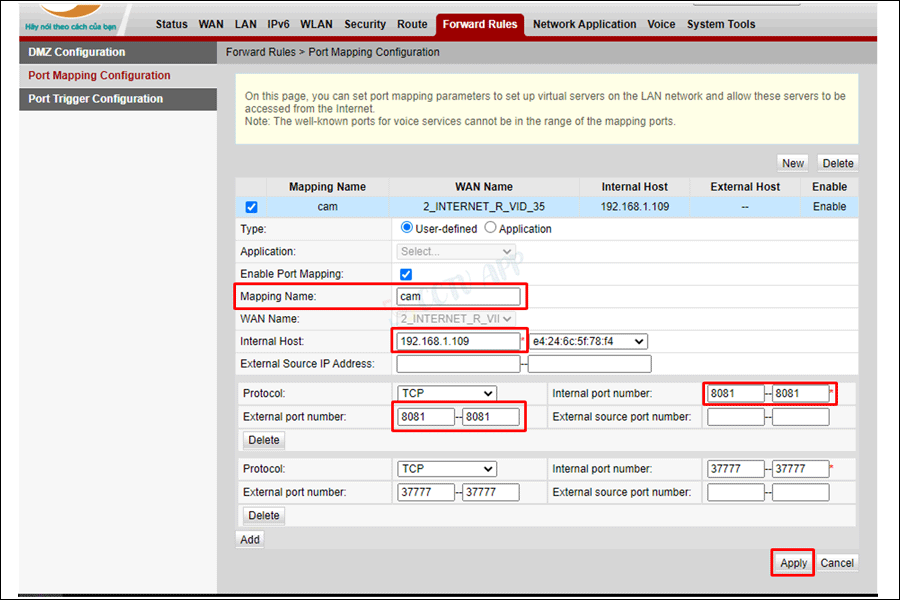 Sau khi tắt tường lửa, bạn tiến hành mở port cho thiết bị cần kết nối. Trong mục “Port Forwarding” hoặc “NAT”, bạn nhập địa chỉ IP nội bộ của camera cùng với số port mà bạn muốn mở. Cuối cùng, nhấn “Apply” để lưu lại các thay đổi.