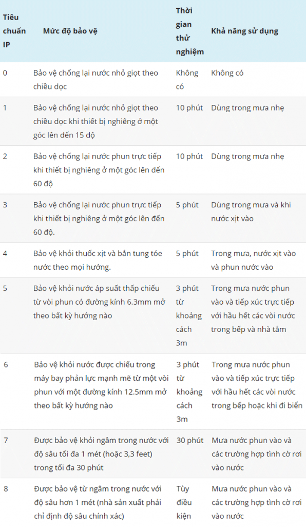 Cụ thể hơn, tiêu chuẩn này được quy định trong IEC 60529, nơi mức độ bảo vệ bụi được xếp loại 6, trong khi khả năng chống nước được xếp loại 7. Điều này có nghĩa là nếu bạn vô tình làm rơi thiết bị vào nước sạch, nó sẽ không bị ảnh hưởng trong thời gian tối đa 30 phút.