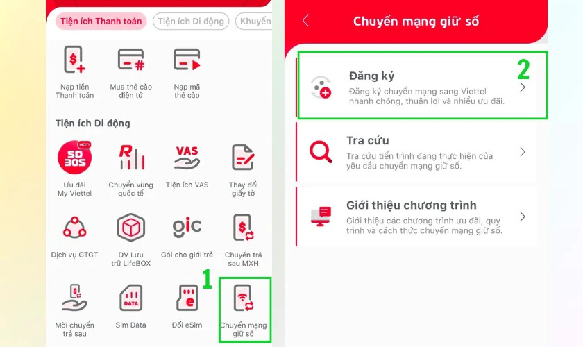 Nếu bạn thích sử dụng ứng dụng trên điện thoại, hãy mở My Viettel và chọn mục Tiện ích khác. Tiếp theo, chọn Chuyển mạng giữ số, đăng nhập vào ứng dụng rồi bấm Đăng ký. Đây là cách dễ dàng và nhanh chóng để chuyển mạng mà không cần phải đến trực tiếp cửa hàng.