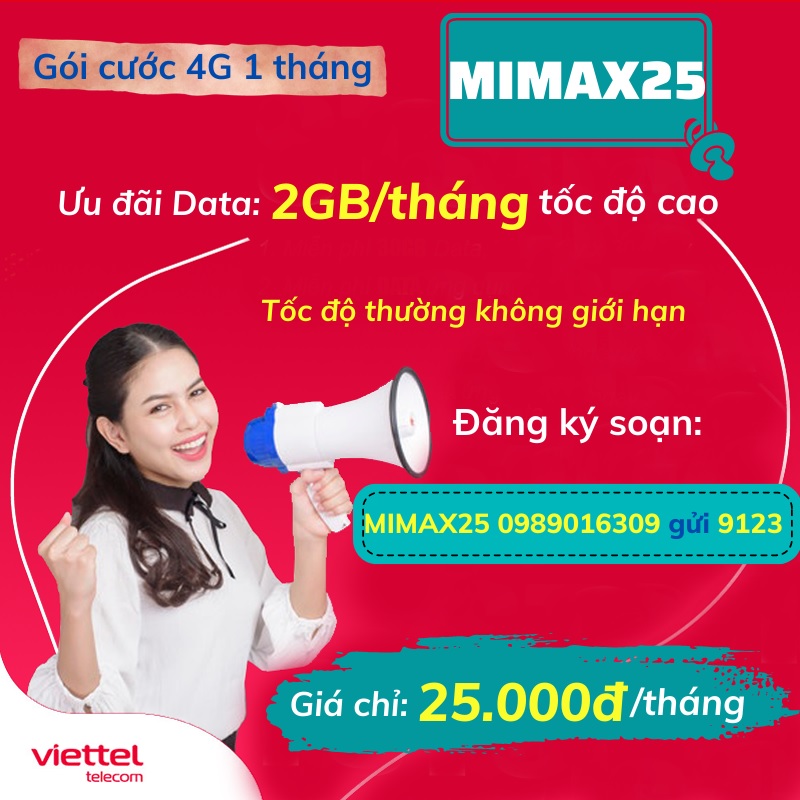 Điểm đặc biệt của các gói cước MIMAX là không chỉ mang lại tốc độ 4G ổn định mà còn thời gian sử dụng lên tới 30 ngày. Bạn có thể dễ dàng lựa chọn gói phù hợp với nhu cầu sử dụng của mình, từ lướt web, xem video đến chơi game. Hãy nhanh tay đăng ký để tận hưởng những trải nghiệm tuyệt vời từ Viettel!