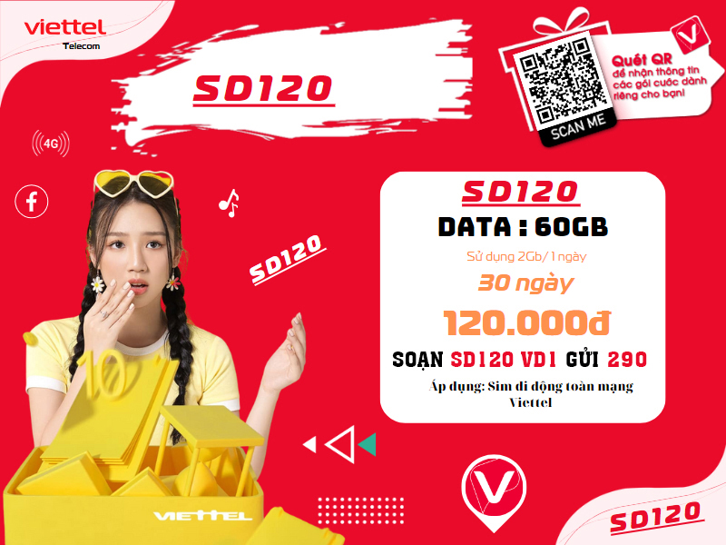 Nếu bạn đang tìm kiếm một gói cước 4G tiết kiệm mà vẫn đảm bảo tốc độ cao, gói SD120 của Viettel chính là lựa chọn hoàn hảo. Với mức phí chỉ 120.000 đồng/tháng, bạn sẽ nhận được tới 50GB dữ liệu tốc độ cao, cùng với 1.5GB mỗi ngày, thỏa sức lướt web, xem video hay chơi game online.