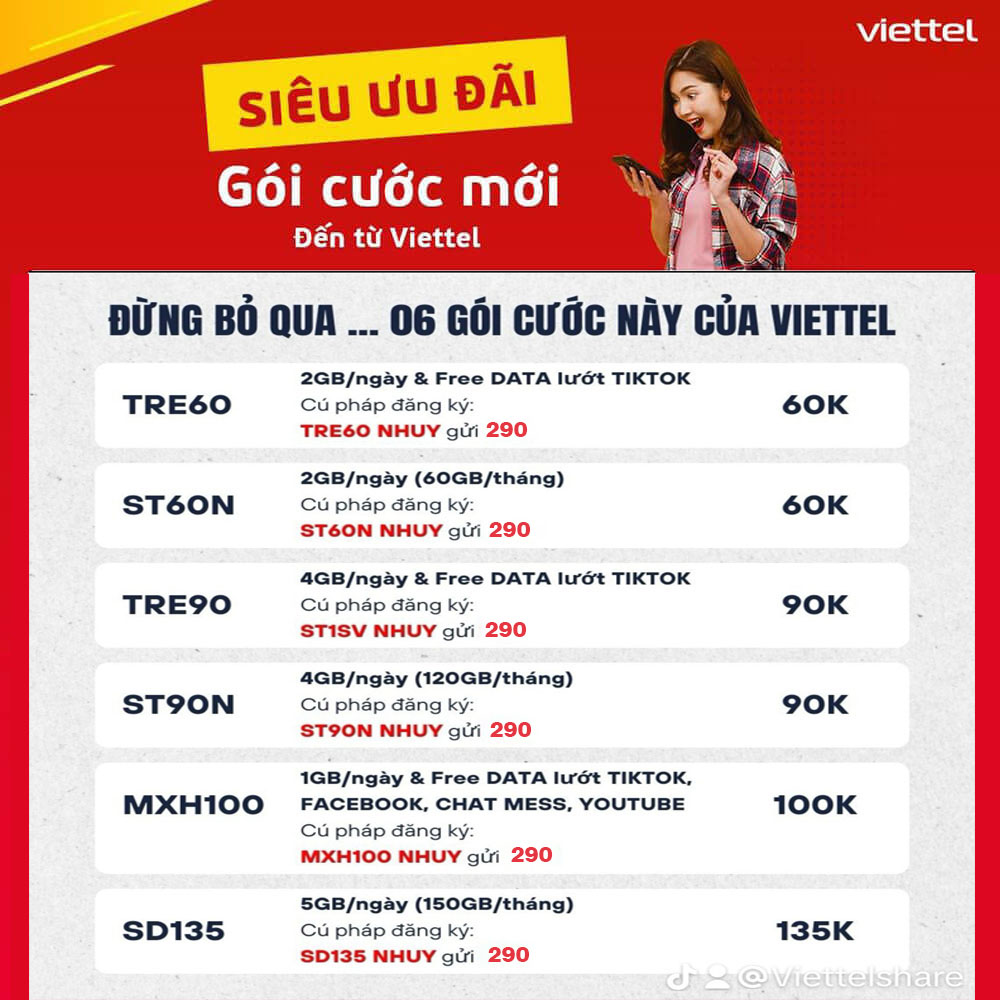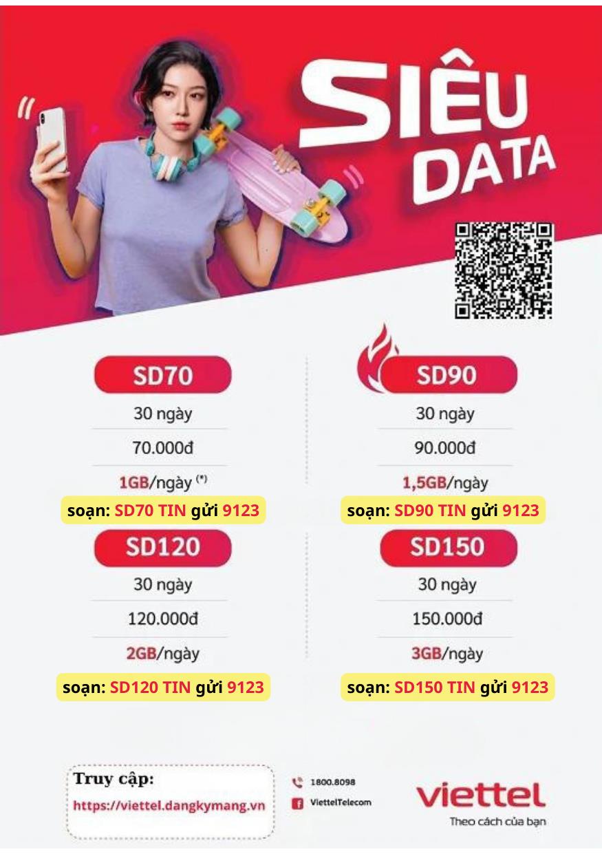 Để đăng ký gói SD150, bạn chỉ cần soạn tin nhắn “SD150” và gửi đến 191 hoặc gọi theo cú pháp *098*8829#. Đặc biệt, Viettel còn có các gói cước khác như SD125T với 7GB+3GB data mỗi ngày chỉ với 125.000 đồng, rất lý tưởng nếu bạn cần nhiều lưu lượng hơn.