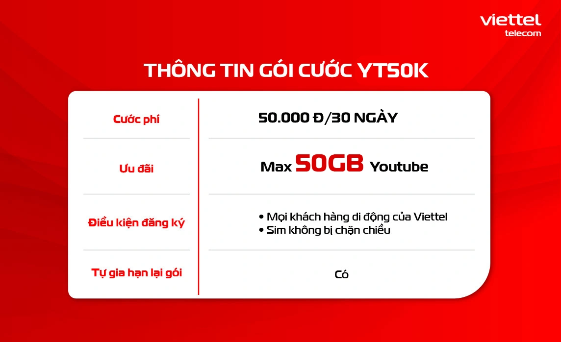 Thêm vào đó, Viettel còn có những gói dài hạn như YT50K với 50GB chỉ 50.000 VNĐ cho cả tháng. Điều này không chỉ tiết kiệm chi phí mà còn mang lại trải nghiệm xem YouTube liền mạch. Với những gói cước linh hoạt và ưu đãi hấp dẫn, bạn chắc chắn sẽ có những giờ phút thú vị, từ việc xem video cho đến livestream mà không lo về hạn chế dung lượng.