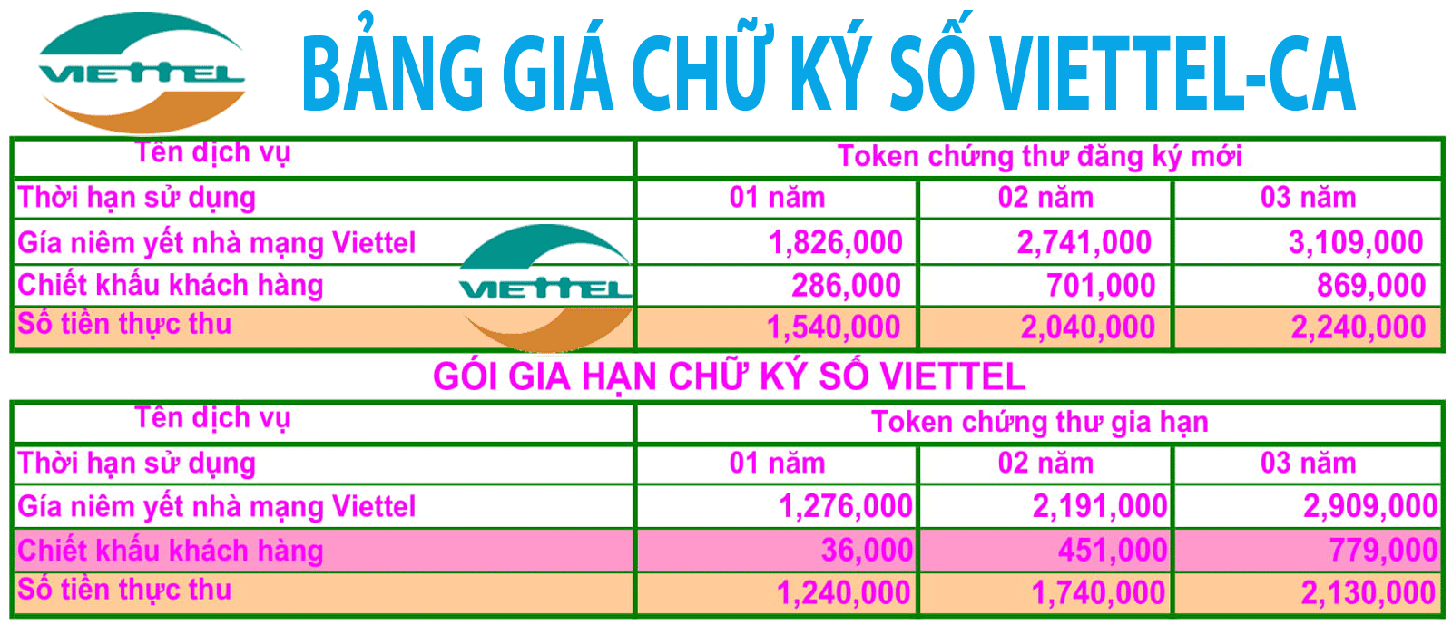 Nếu bạn đang tìm kiếm dịch vụ chữ ký số, Viettel CA là một lựa chọn tuyệt vời. Giá cho chứng thư số chính thức của Viettel dao động từ 1.252.000 VNĐ đến 3.052.000 VNĐ, tùy theo thời gian sử dụng 1, 2 hoặc 3 năm. Đặc biệt, Viettel có nhiều chương trình khuyến mãi hấp dẫn giúp bạn tiết kiệm chi phí.