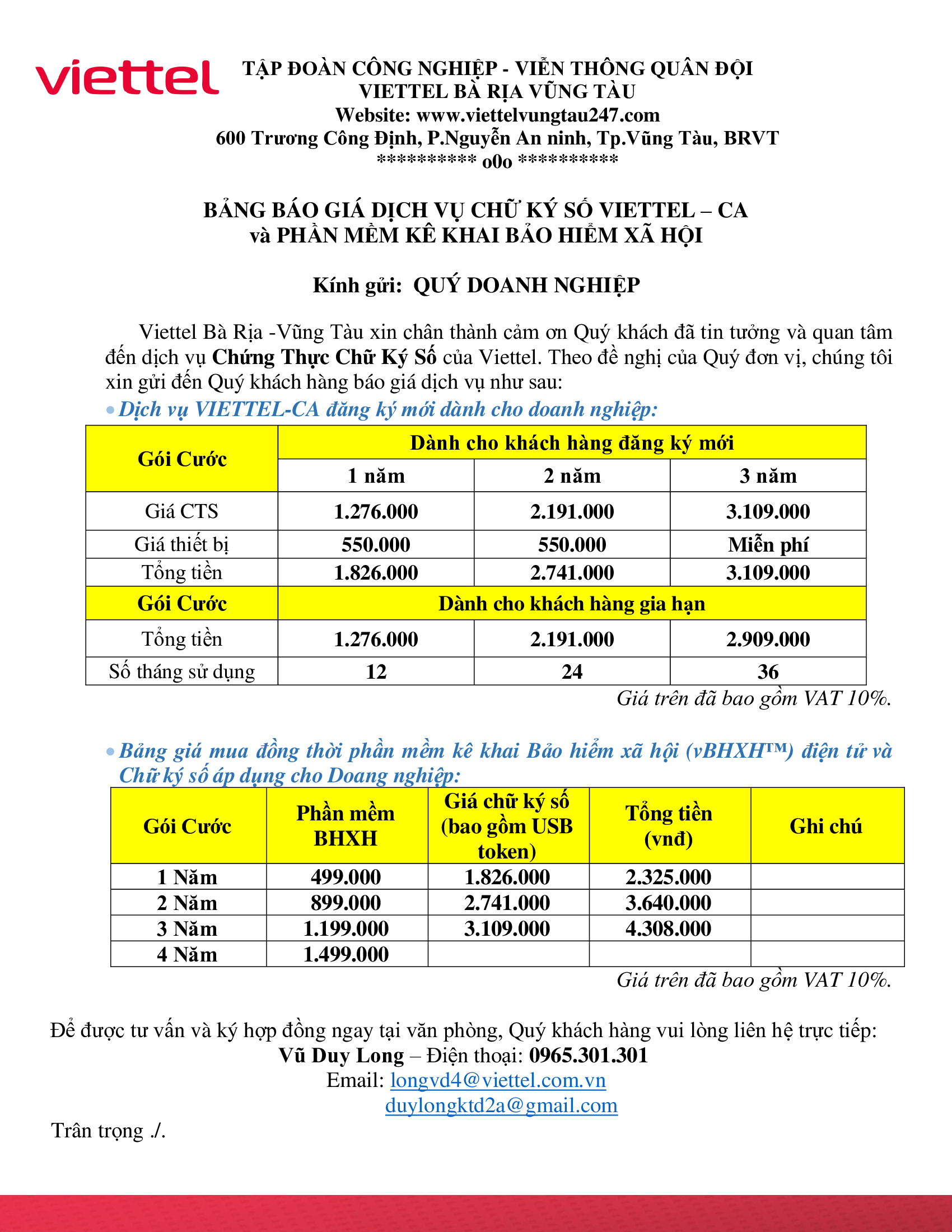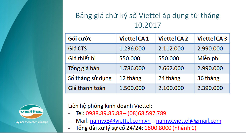 Chữ ký số Viettel là giải pháp đáng tin cậy cho các doanh nghiệp và tổ chức trong việc chứng thực điện tử, rất cần thiết trong thời đại số. Theo bảng báo giá mới nhất cho năm 2025, giá cho chữ ký số USB Token Viettel-CA bắt đầu từ 1.450.000 VNĐ cho gói 1 năm, 1.750.000 VNĐ cho gói 2 năm đến 1.900.000 VNĐ cho gói 3 năm. Mức giá này đã bao gồm VAT 8%.