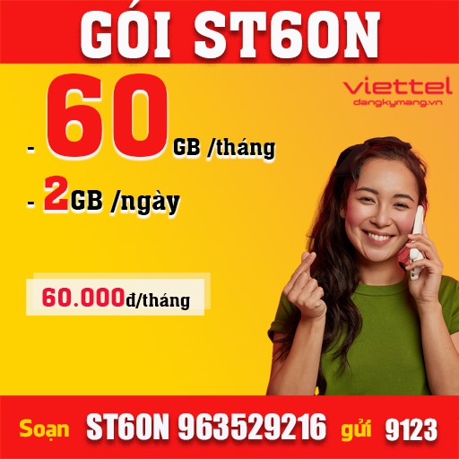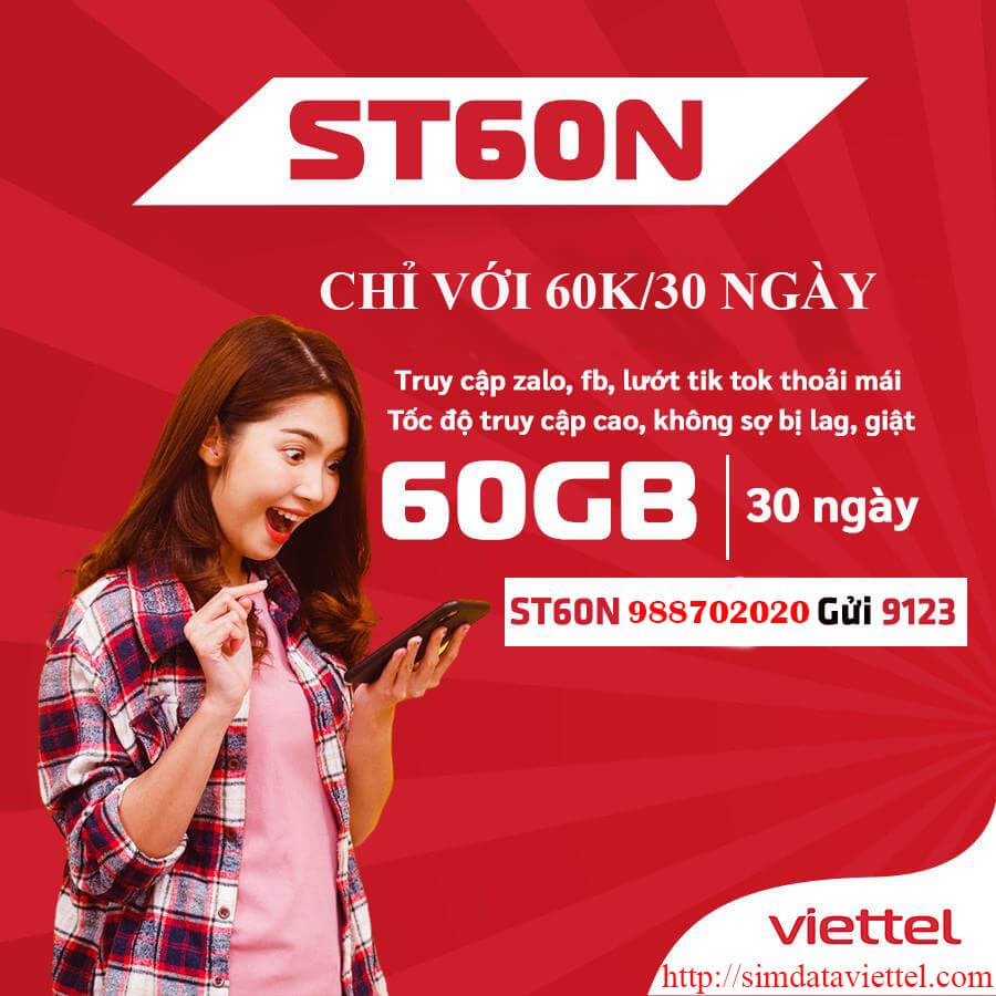 Nếu bạn đang tìm kiếm một gói cước ưu đãi tiện lợi từ Viettel, gói ST60N chính là lựa chọn hoàn hảo. Với mức giá chỉ 60.000 đồng cho 30 ngày, bạn sẽ nhận được 60GB data tốc độ cao, tương đương với 2GB mỗi ngày. Điều này rất phù hợp cho những ai thường xuyên sử dụng internet để lướt web, xem videos hay kết nối mạng xã hội.
