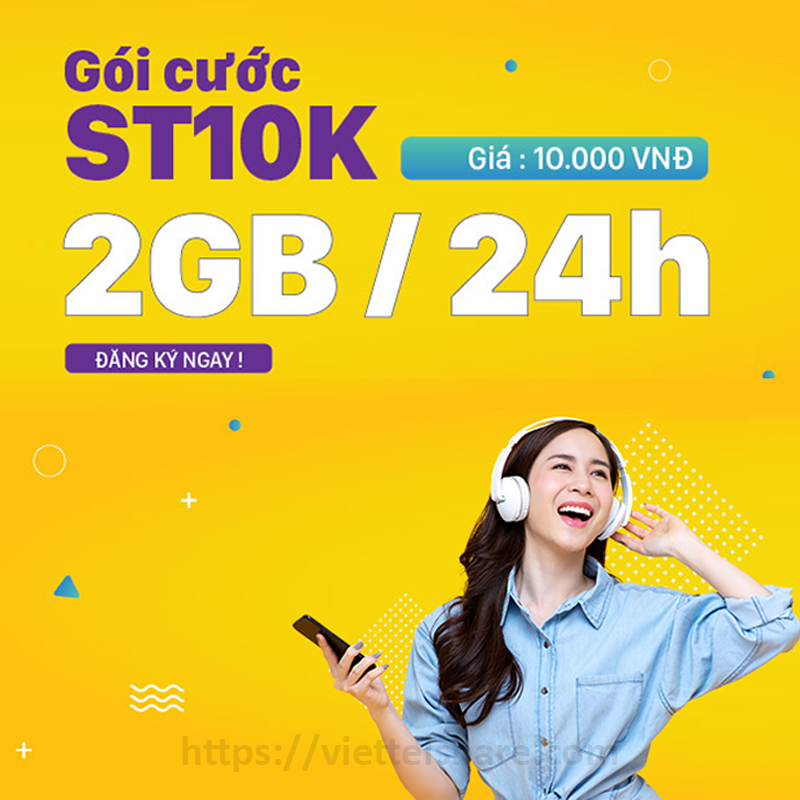 Nếu bạn đang tìm kiếm một gói cước 3G hoặc 4G tiện lợi với 2GB dữ liệu sử dụng mỗi ngày, thì gói ST10K của Viettel chính là sự lựa chọn tuyệt vời. Chỉ với 10.000 đồng, bạn có thể thỏa sức lướt web, xem video và chơi game trong suốt 24 giờ. Để đăng ký, bạn chỉ cần soạn tin nhắn “ST10K” gửi 191 hoặc gọi *098*16#.