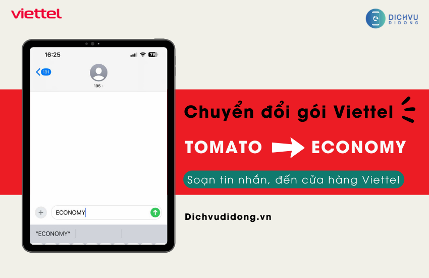 Chuyển đổi gói cước giữa Economy và Tomato của Viettel thật đơn giản và nhanh chóng. Nếu bạn muốn chuyển từ gói Economy sang gói Tomato, chỉ cần thực hiện hai bước. Đầu tiên, soạn tin nhắn “TOMATO” gửi đến số 195. Sau khi gửi, bạn sẽ nhận được tin nhắn xác nhận từ tổng đài.