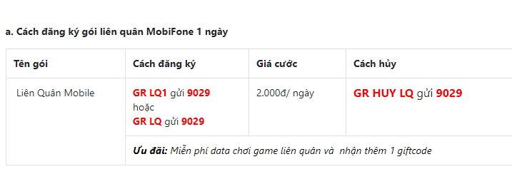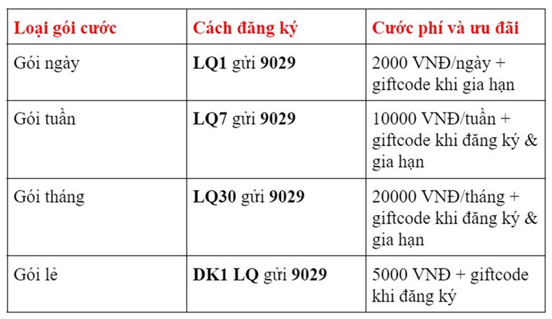 Ngoài ra, nếu bạn muốn sử dụng gói cước dài hạn hơn, bạn có thể đăng ký gói LQ30 bằng cách soạn tin nhắn LQ30 gửi 9029 với giá chỉ 20.000 VNĐ/tháng. Đặc biệt, khi đăng ký thành công, bạn sẽ nhận được giftcode hấp dẫn để trải nghiệm nhiều hơn.