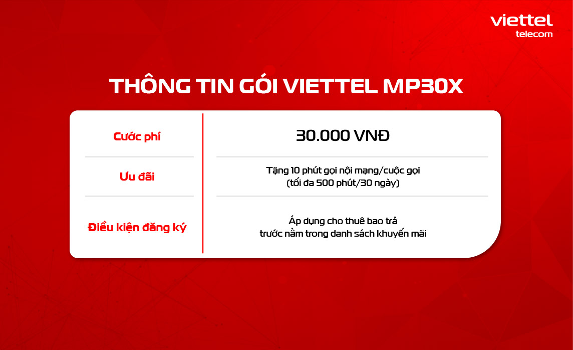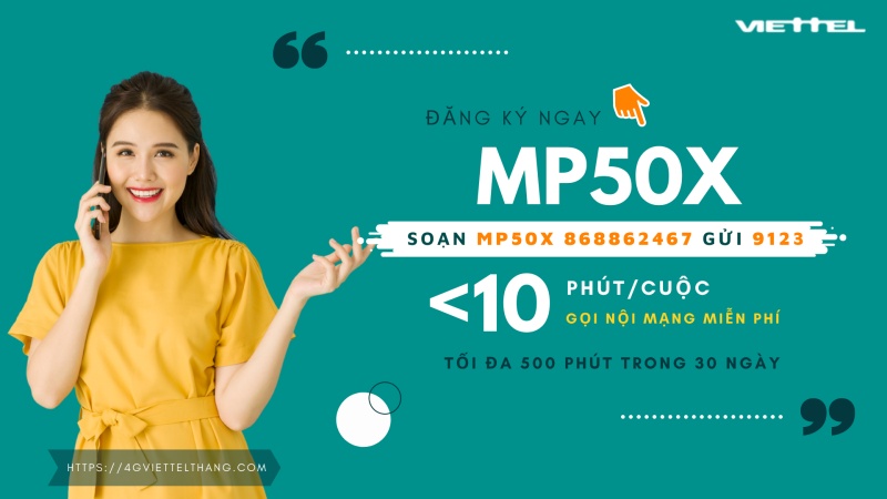 Ngoài ra, Viettel còn có gói MP30X, cho phép miễn phí cước gọi cho 10 phút đầu tiên cho mỗi cuộc gọi, giúp bạn tiết kiệm đáng kể trong việc liên lạc nội mạng. Nếu không sử dụng hết số phút miễn phí này, bạn cũng không phải lo lắng vì gói cước vẫn mang lại giá trị sử dụng cao.
