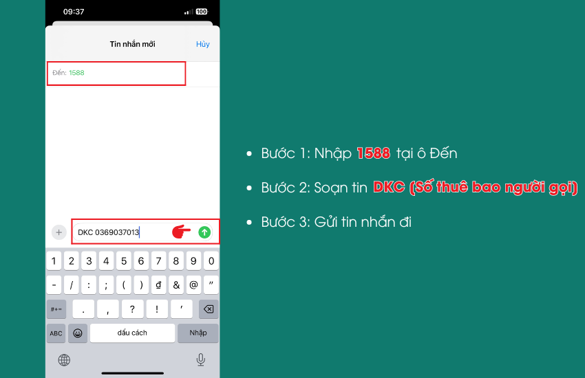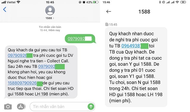Ngoài việc gọi điện, người dùng có thể dễ dàng gửi tin nhắn đến 1588 với số điện thoại cần gọi. Ví dụ, chỉ cần soạn “0979366xxx” và gửi đến 1588, tiện lợi không kém gì việc gọi trực tiếp. Khách hàng của nhà mạng Viettel chỉ cần bấm 1588 cùng số điện thoại và nhấn “Gọi”, trong khi Vinaphone và Mobifone cũng có cú pháp riêng để thực hiện dịch vụ này.
