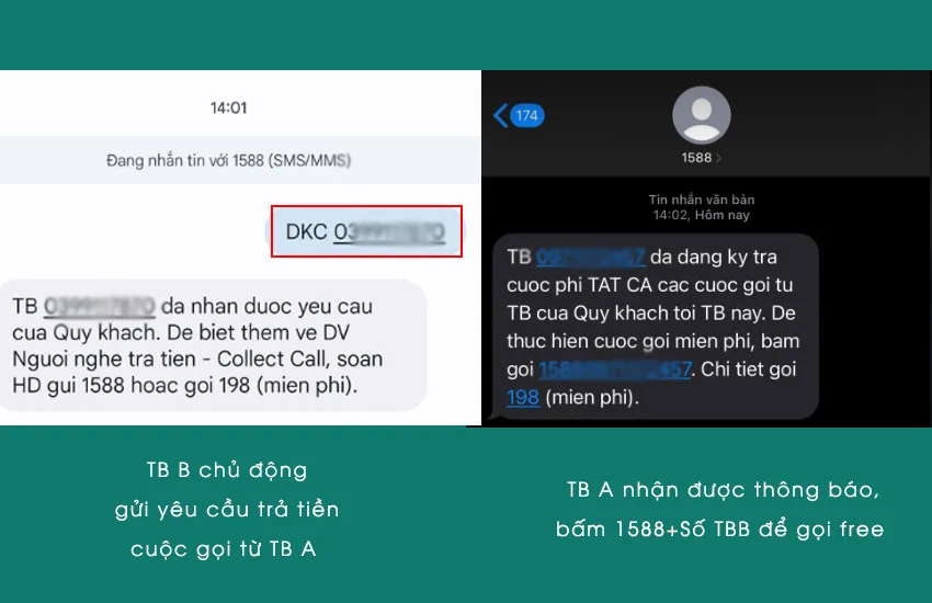 Chỉ cần gửi tin nhắn soạn SĐT thuê bao B đến 1588, bạn đã có thể yêu cầu người nhận trả phí cuộc gọi. Việc này không chỉ tiện lợi cho người gọi mà còn giúp người nhận biết rõ ràng về khoản phí mà mình sẽ gánh chịu. Nếu bạn là người nhận, bạn có thể dễ dàng đồng ý trả phí cho một hoặc tất cả cuộc gọi bằng cách nhắn tin theo hướng dẫn.