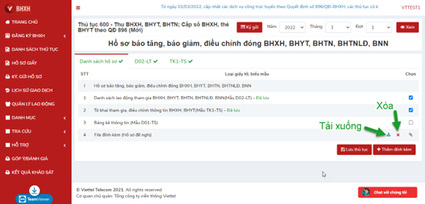 Sau khi đã chọn kỳ kê khai, bạn nhấn “Đồng ý” để tiếp tục. Tiếp theo, vào danh sách hồ sơ và nhấn vào biểu tượng đính kèm để tải lên tập tin cần thiết. Đừng quên chọn đúng đợt, tháng và năm mà bạn muốn báo tăng. Một thao tác nhỏ nữa là bạn có thể chọn tờ khai cần kết xuất báo cáo từ danh sách có sẵn.