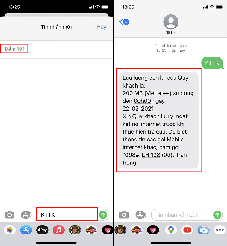 Ngoài ra, bạn cũng có thể kiểm tra gói cước qua tin nhắn. Chỉ cần soạn tin nhắn theo cú pháp “KTTK” và gửi tới 191. Bạn sẽ nhận được phản hồi ngay lập tức từ tổng đài, hiển thị thông tin chi tiết về gói data mà bạn đang sử dụng.