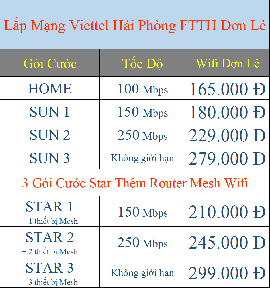Nếu bạn đang sinh sống tại Hải Phòng và đang tìm kiếm một gói cước internet chất lượng với giá cả hợp lý, thì Viettel chính là lựa chọn tuyệt vời. Với mức giá chỉ từ 180.000 đồng/tháng, bạn có thể đăng ký gói NETVT1 với tốc độ 300 Mbps, đủ để đáp ứng nhu cầu sử dụng của gia đình.