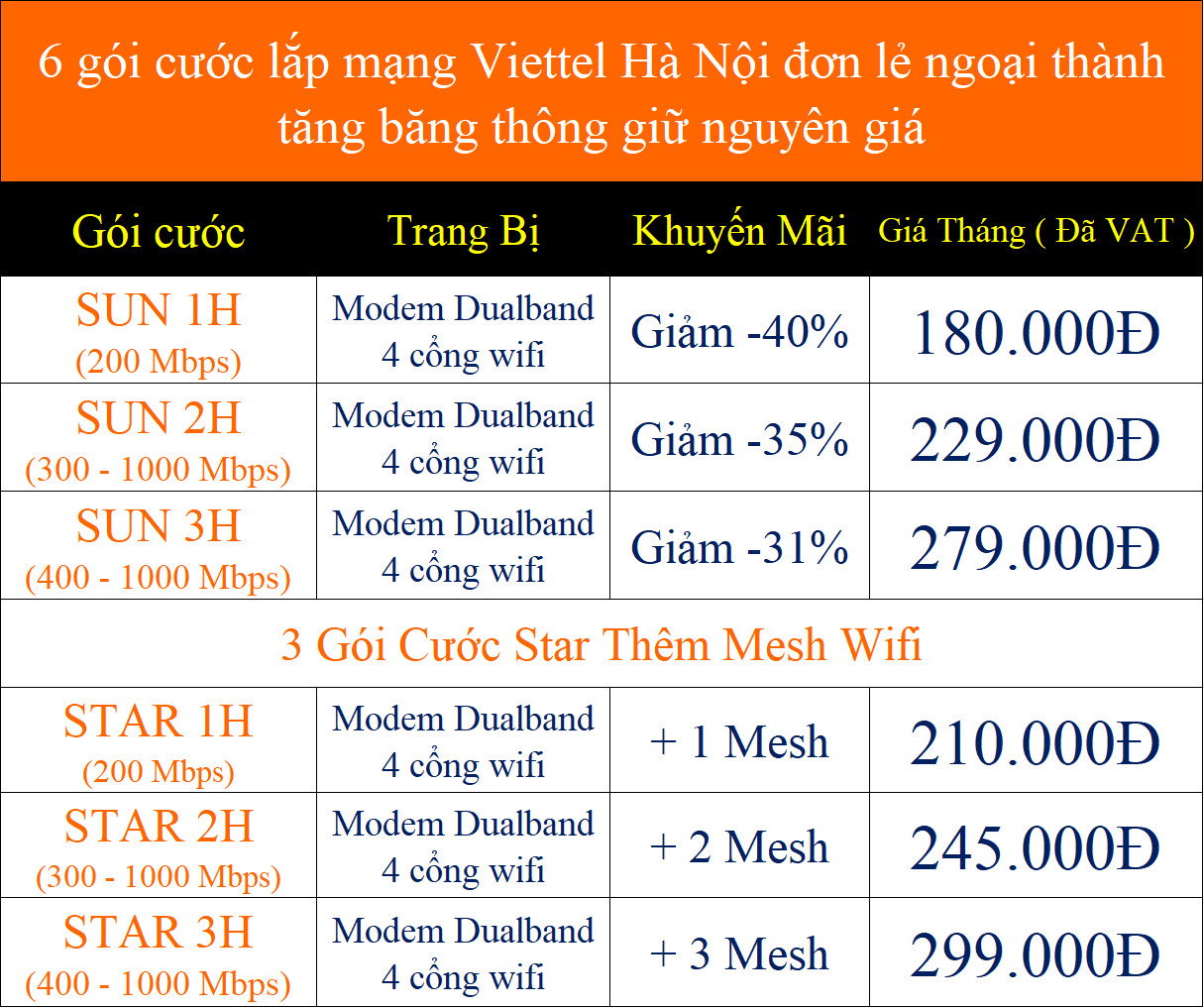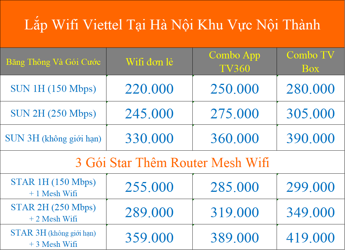 Gói cước SUN1H giá chỉ 220.000 đồng/tháng rất phù hợp cho các gia đình có từ 1 đến 5 thiết bị kết nối. Ngoài ra, Viettel cũng cung cấp nhiều gói cước tốc độ cao khác cùng giải pháp Mesh WiFi để đảm bảo tín hiệu mạnh mẽ, ổn định khắp ngôi nhà.