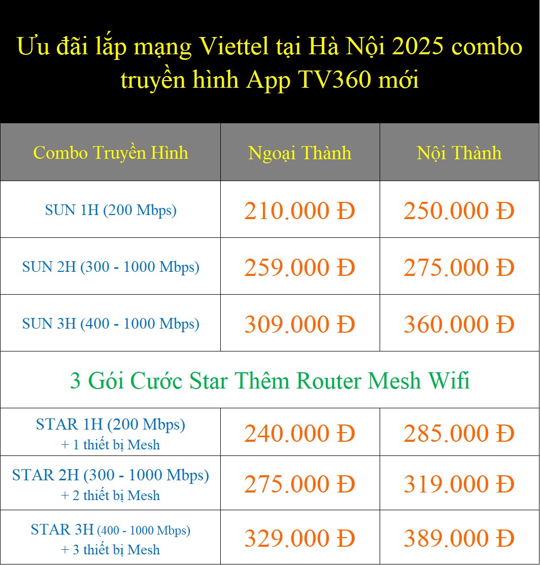 Viettel cung cấp nhiều gói cước Internet hấp dẫn, phù hợp với nhu cầu sử dụng của người dân Hà Nội. Chẳng hạn, gói cước SUN1H với tốc độ 150Mbps chỉ 220.000 VNĐ, hoặc gói SUN2H với tốc độ 250Mbps có giá 245.000 VNĐ. Đặc biệt, tốc độ Internet còn có thể lên đến 1Gbps, rất lý tưởng cho những gia đình sử dụng nhiều thiết bị cùng lúc.