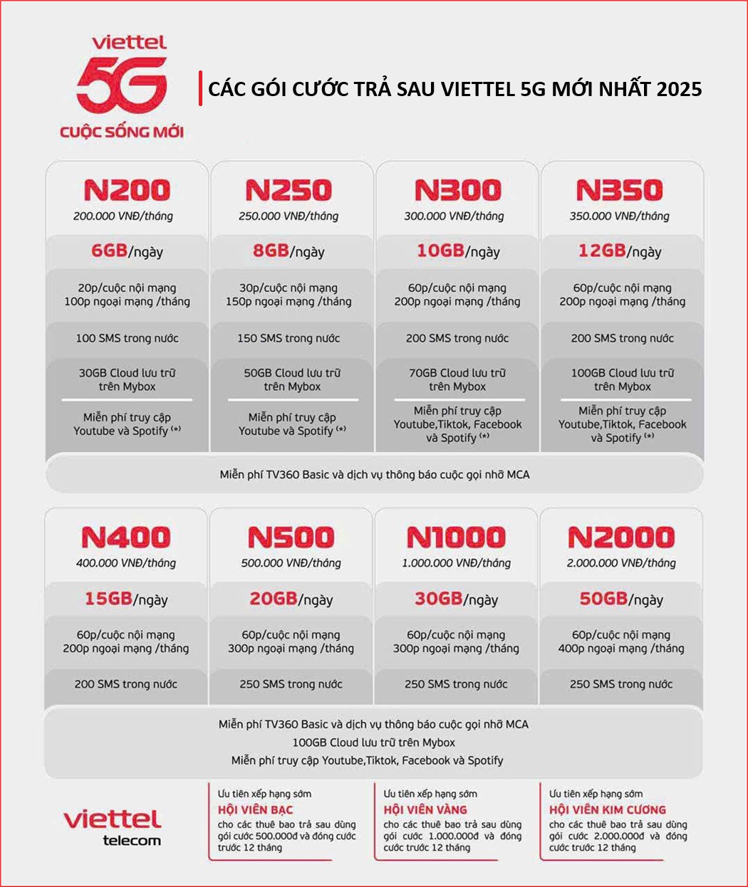Trong năm 2025, Viettel tung ra nhiều gói cước hấp dẫn như N200, N250, N300,… với tốc độ cao và dung lượng lớn, phù hợp với mọi nhu cầu sử dụng. Nếu bạn muốn sử dụng các gói 4G mimax, thì thuê bao trả sau cũng hỗ trợ bạn tham gia. Điều này mang lại linh hoạt cho người dùng trong việc lựa chọn gói cước.